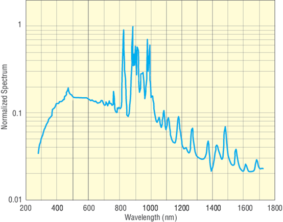 100W氙燈光源采用無臭氧氙燈(6002)作為照明光源,氙燈光譜覆蓋紫外、可見和近紅外,和太陽光譜其近似,廣泛作為太陽能模擬器。因高功率、寬譜輸出而受吸收和熒光激發(fā)等歡迎。光譜范圍260nm以上,無臭氧。